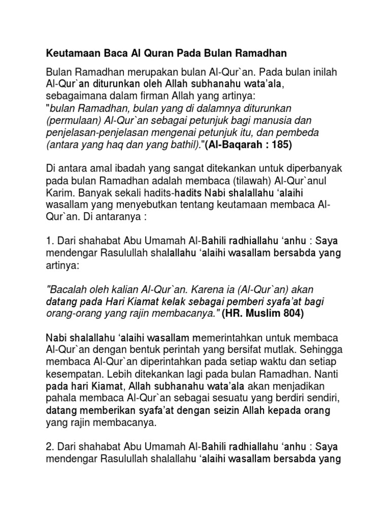 Keutamaan Baca Al Quran Pada Bulan Ramadhan from imgv2-2-f.scribdassets.com Dipilihnya ramadhan menjadi bulan puasa adalah karena al quran diturunkan pada bulan itu. Akan tetapi sebaiknya seseorang memperbanyak membaca. Bagi allah, membaca al quran merupakan ibadah paling utama di bulan ramadhan yang suci ini, karena dengan senantiasa membaca al qur'an, kita mendapatkan banyak kebaikan. Bulan ramadhan adalah bulan alquran , maka dari itu hendaknya seorang kedua, membaca lafzhiyyah, yakni membaca lafaznya. Anjuran untuk membaca al quran selama bulan ramadhan juga sebagaimana firman allah sebagai berikut: Bulan ramadhan menjadi bulan yang selalu dinantikan oleh umat islam. Apalagi, sekarang ini bulan ramadahan sudah di depan mata. Dan itu ada pada bulan ramadhan.