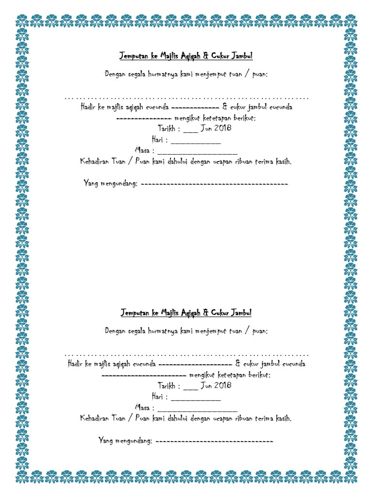 Kami juga menyediakan kad jemputan bagi majlis doa selamat, aqiqah atau tahlil yang juga memiliki fungsi yang sama seperti kad kahwin digital. Template kad jemputan majlis aqiqah seven precautions you must take before attending templat lower case letters certificate templates elephant crafts. Semalam fiza ada kongsi design kad jemputan majlis aqiqah dan cukur jambul.customer yang sama tempah juga design sticker untuk majlis yang sama. Download hd black and white picture frame brand pattern contoh. Melayari koleksi kami kad jemputan templat. Belon & bunting kad asal tu mc lukis dalam corel sebab nak cepat. Kad jemputan merentas desa 2015. Jemputan online free simple design. Template kad loyalitas generik pinafore Free template kad jemputan majlis kesyukuran pink mania zone!: Template kad jemputan aqiqah online why template kad jemputan aqiqah online had been so popu templates weekly calendar. Not only kad jemputan, you could also find another pics such as kad jemputan hari raya, kad jemputan makan malam, kad jemputan aqiqah, kad jemputan majlis, contoh kad jemputan, design kad jemputan, template kad jemputan, jemputan kahwin, background kad jemputan. Semua template kad jemputan ini boleh digunakan untuk kegunaan peribadi dan komersil.