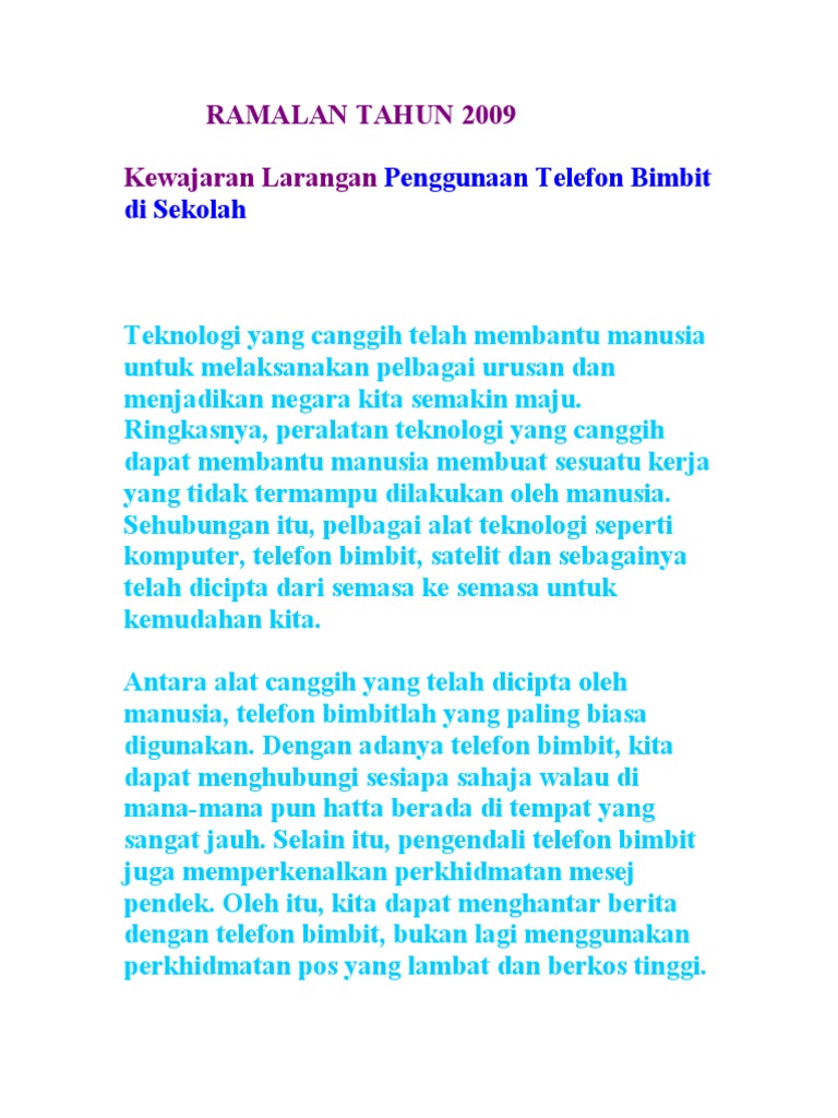 Telefon bimbit merupakan salah satu alat komunikasi yang diperlukan pada masa kini. Tetapi, penggunaan telefon bimbit di sekolah perlu dikawal supaya tidak mengganggu kelancaran proses pengajaran dan pembelajaran termasuk panduan ini dinyatakan dalah pekeliling ikhtisas bilangan 11/2005. Telefon bimbit yang berimitasi akan membahayakan keselamatan diri pelajar. ••• telefon bimbit memang penting bagi kehidupan seharian namun ia juga boleh memberi keburukan pada sisi kehidupan yang lain. Pada suatu masa dahulu, telefon bimbit dianggap sebagai barangan mewah yang tidak mampu dimiliki oleh kebanyakan orang selain bentuknya yang besar dah.