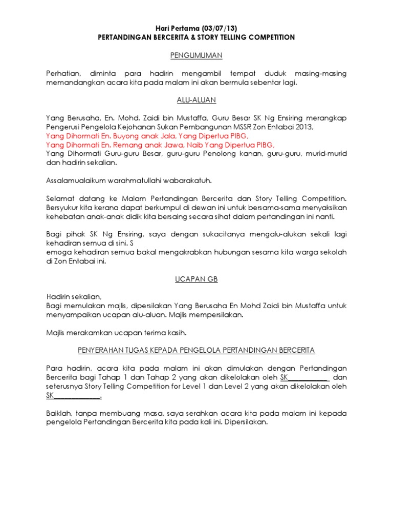 Mc merupakan singkatan dari master of ceremony / pembawa acara. Untuk membuatnya lebih mudah bagi anda. Johan pertandingan bercerita bm tahap 1 peringkat negeri selangor 2011 pada 27 jun 2011 bertempat di sk kuala selangor. Penjelasan lengkap seputar contoh teks mc formal dan non formal yang baik dan benar. Download teks pengacara majlis pertandingan bercerita.