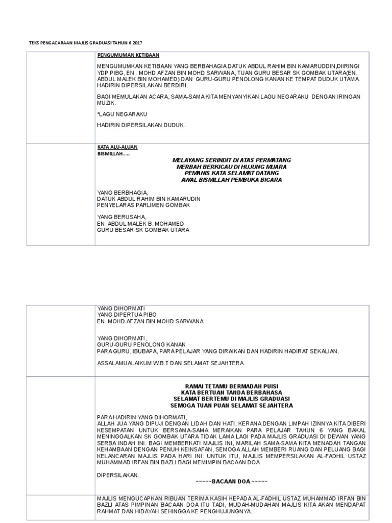 Teks Pengacaraan Majlis Graduasi Pra U Smk Majakir Tahun 2013 from demo.dokumen.tips Di sebuah komplek perumahan yang tidak begtu elit di jakarta timur tinggal seorang anak bernama bayu. Majlis dimeriahkan lagi dengan persembahan sketsa, persembahan daripada murid tahun 5a. 2 mengisytiharkan majlis graduasi tahun 6 sksb tahun 2017 bermula. Bagi memastikan majlis berjalan dengan lancar, hadirin diingatkan agar mematikan atau memastikan telefon bimbit berada dalam pengaturcaraan senyap. Terima kasih diucapkan kepada semua yang telah memberikan kerjasama. Teks juruacara majlis graduasi sekolah by valerie sinti 10528 views. Mencari villa impian lebih mudah dengan banyak pilihan. Juga sesuai diubahsuai untuk program sambutan lain dan juga peringkat daerah serta kebangsaan.